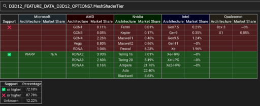 analysis of GPU market share and D3D12 feature support using Steam Hardware Survey and D3d12infoDB examines adoption rates for DXR, Shader Model 6.6-6.8, Mesh Shaders, Enhanced Barriers, VRS, and Work Graphs across GPU architectures