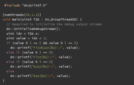 presents a prototype implementation of printf debugging for HLSL shaders uses compile-time string table extraction and builtin functions to convert format strings into buffer offsets implemented entirely in HLSL using variadic templates