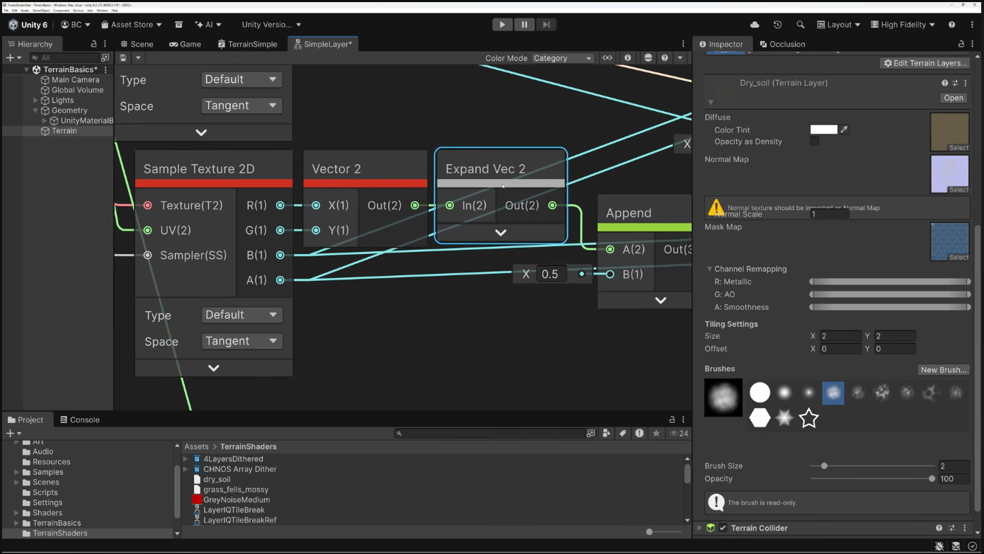 demonstrates using the Terrain Texture Node in Unity's Shader Graph to import terrain-system parameters for material layer settings shows how to adjust layer properties (color tint, opacity, etc.) and notes practical Inspector/HDRP quirks