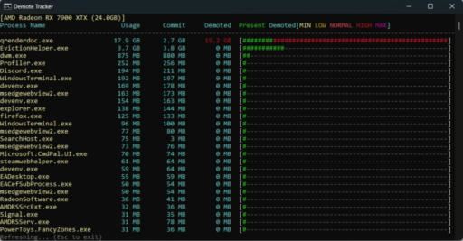a small Win32 command-line tool for tracking GPU memory usage and demoted memory across all running processes on Windows visualizes how much VRAM has been demoted to system RAM