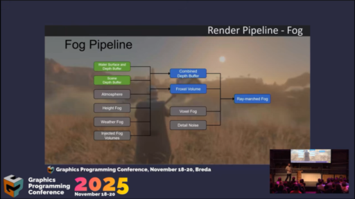 covers distinct media types found in Enshrouded based on sparse virtual-texture voxel with BC-compressed 16³ tiles, top-down weather fog, VFX-spawned dynamic volumes, a 2D cloud density map, and water stored as a sparse signed distance field presents how to combine the various sources to create the effects