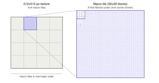 reverse engineers Apple's undocumented Metal Lossy Compression format describes the memory layout: variable-size blocks packed within 128-byte tiles, with per-block metadata details the multiple encoding modes supported