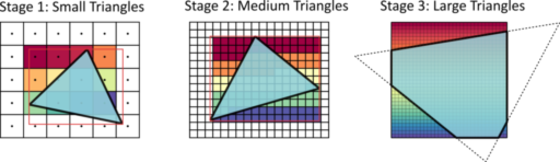 a CUDA-based software rasterizer capable of large triangle-count datasets without precomputed LODs or acceleration structures uses a 3-stage pipeline: small triangles are rasterized by one thread, larger triangles by one warp, and the largest triangles are split and queued for a third stage presents performance comparisons against Vulkan-based hardware rasterization