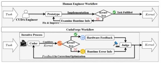 presents a multi-agent workflow for automatic CUDA kernel generation and optimization uses LLM agents to iteratively generate, correct, and optimize kernels while integrating Nsight Compute metrics