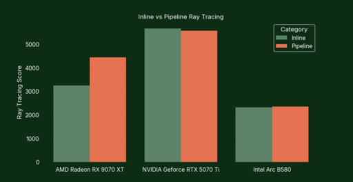 compares inline and pipeline ray tracing approaches with detailed explanations benchmarks both methods on AMD, NVIDIA, and Intel Arc shows AMD achieves significantly better performance with pipeline ray tracing, while NVIDIA and Intel perform similarly with both approaches