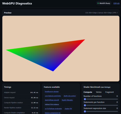 introduces a diagnostic tool for measuring WGSL shader compilation times in WebGPU provides complexity sliders to generate shaders of various sizes for benchmarking reveals significant differences between cold and warm compilation timings across browsers