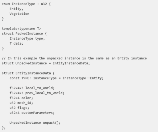 presents a per-instance encoding technique for GPU-driven rendering with varying instance data requirements instances use type discriminants to allow different memory layouts within a unified buffer reduces memory bandwidth and footprint by eliminating unused fields allows different instance types to coexist efficiently in the same buffer