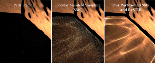 extends Specular Manifold Sampling for interactive caustic rendering using tile-based sample space partitioning restricts expensive Newton iterations to the vicinity of seed paths by building per-frame prior distributions applies ReSTIR spatiotemporal resampling to amortize sample generation costs and achieve variance reduction