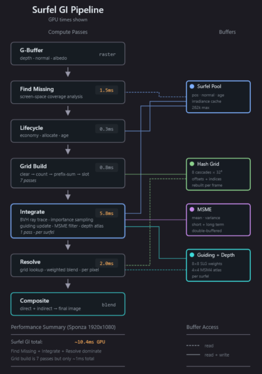 implements a complete surfel-based global illumination pipeline in WebGPU, including surfelization, spatial acceleration structures, ray tracing, and temporal filtering employs advanced techniques such as surfel-guided light sampling to reduce noise, multi-scale mean estimators for temporal stability, and radial depth atlases to prevent light leaking through thin geometry