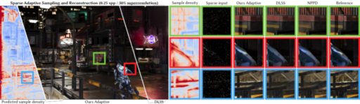 presents an adaptive sampling and denoising pipeline designed for less than one sample per pixel path tracing systems introduces stochastic sample placement formulation enabling gradient estimation demonstrates consistent improvements over uniform sparse sampling, particularly in reconstructing specular highlights and shadow boundaries using tonemapping-aware training