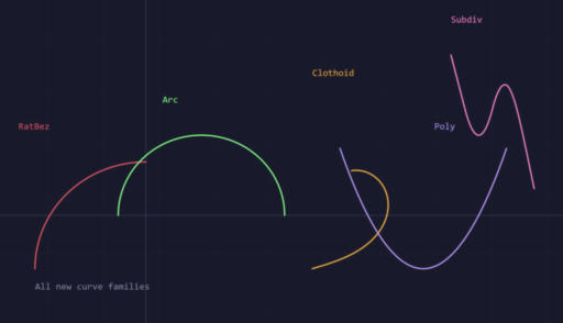dependency-free C11 library covering 13 curve families (Bezier, Hermite, Catmull-Rom, B-Spline, NURBS, clothoid, subdivision, and more) and 5 surface types (Bezier patch, B-Spline, NURBS, swept, ruled) with a uniform create/evaluate/sample/traverse/inspect API evaluation kernels are header-only and compile unchanged across four backends (C, HLSL, GLSL, and Halide)
