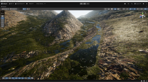 video showing how to add rain effects (puddles, raindrops, ripples) to a Unity terrain shader adapts the built-in rain floor subgraph for the needs of the trrain improves puddle by modulating the puddle mask with terrain height data