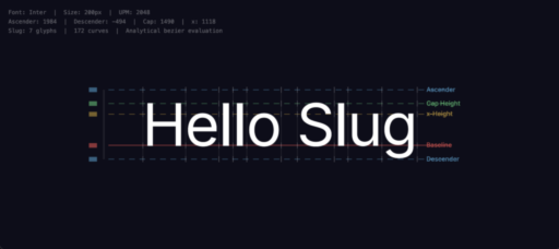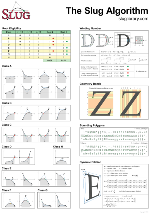 Eric Lengyel reflects on 10 years of the Slug algorithm for GPU text rendering directly from Bézier curve data, detailing evolutionary simplifications since the 2017 JCGT paper introduces "dynamic dilation" for antialiasing without any manually-tuned constant announces that the Slug algorithm patent is permanently dedicated to the public domain with reference HLSL shaders—including dynamic dilation—released on GitHub under the MIT license