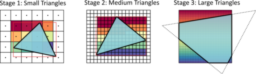 • uses a 3-stage pipeline: small triangles are rasterized by one thread, larger triangles by one warp, and the largest triangles are split and queued for a third stage